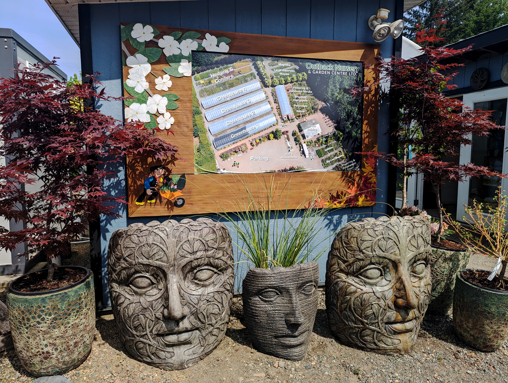 Outback Nursery began in 1998-199 when our parents, ??? retired to the island from Aldergrove. They asked if we, ??? would be interested in joining them on this adventure so we purchased this heavily treed property. iWe began cleaning the trees and settled into country life. We even tried our hand at raising turkeys and pigs. Se nstarted grpwomg sp,e jedgomg amd conifers . We joined thfarmer’s market.,As our inventory expeanded we began running a spec truck down island to stoop various places along route to show our quality product to potential customers. Over time and little by little the property was clared and the greenhouses grew and irrigation zones increased. In the beginning we were limited to wholesale and landscape clientele, but as interest in our nursery grew we opened to the public and our small centre became what it is today. Always a labour of love and always with the heart of the family and community