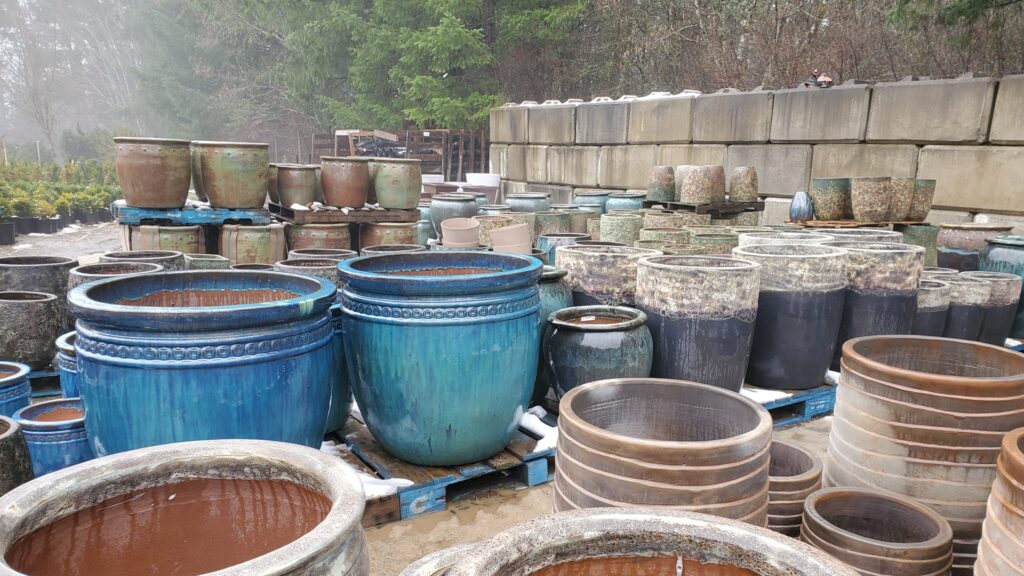 An assortment of oversized glazed pottery and birdbaths from our vendor in Vietnam.  Hand selected and ordered by the container.